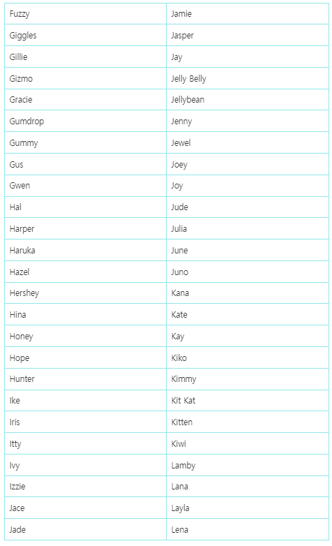 세상에서 사용 가능한 모든 고양이 이름 중 가장 귀여운 것을 결정하는 것은 매우 주관적이지만 귀여운 이름을 지정하는 데 인기 있는 테마가 있습니다. 사람들은 별명, 장난스럽게 들리는 이름, 말하기 재미있는 이름, 과일/음식(키위, 복숭아, 사과, 올리브) 또는 기타 작은 동물이나 동물의 특성과 같은 무생물인 "귀여운" 것에 자주 사용되는 이름을 사용하는 것을 좋아합니다. 아기 동물 (토끼, 강아지, 푹신한, 미니, 작은 등). 또한 사람들은 Poppy, Lily, Rosie, Buttercup, Sunflower(Sunny) 등과 같은 꽃 이름을 정말 좋아하는 것 같습니다. 남자 고양이의 경우 Sailor, Gilly, Bea, Benny 또는 Sammy와 같은 재미있는 이름을 좋아할 수 있습니다.
